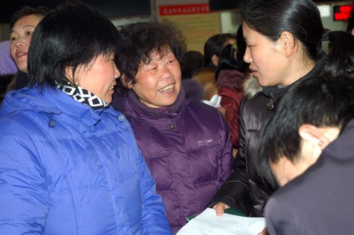 “4050”應(yīng)聘人員在互相交流求職信息。(記者?王映?攝)