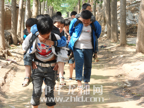 上學路上有段泥路,每逢下雨時,大孩子幫助小孩子趟水走過????