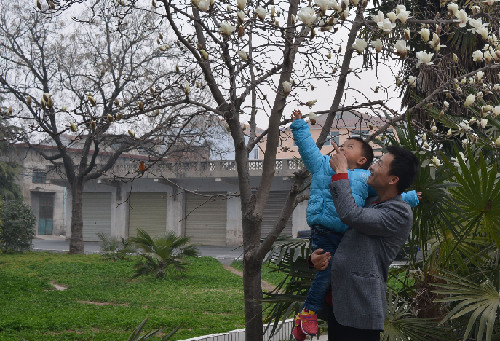 ????春風(fēng)送暖,各種花次第開放,引得市民爭(zhēng)相品味醉人的春色。圖為昨日扶溝縣一對(duì)父子在觀賞盛開的木蘭花。扶溝縣大力開展生態(tài)林業(yè)建設(shè),營造良好的人居環(huán)境。春天一到,鮮花斗艷,春草吐綠,處處春色醉人。(記者 王泉林 攝)