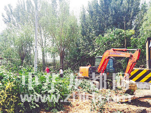 8月22日10時(shí),記者在大慶路橋北西側(cè)的濱河路上看到,市園林處的工作人員在平整場地、清除雜草、移栽苗木。
