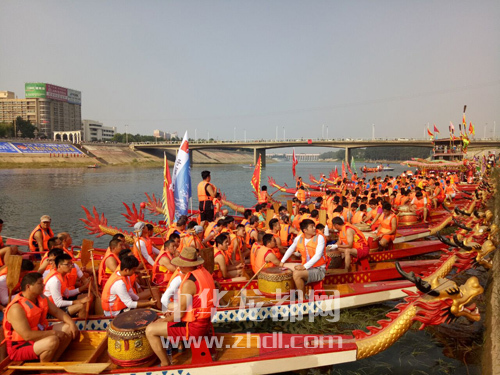 ????當(dāng)日9時(shí)許,位于周口市區(qū)中州大道橋旁的中華龍舟大賽基地鑼鼓喧天,人潮涌動(dòng),不少市民攜家?guī)Э谇皝碛^戰(zhàn)。河中,20多條龍舟整齊地排列在水面上(如圖),等待“點(diǎn)睛”時(shí)刻的到來。一點(diǎn)龍眼,風(fēng)調(diào)雨順、國(guó)泰民安……點(diǎn)睛人分別為龍舟“點(diǎn)睛”后,第三屆中華龍舟大賽正式拉開帷幕。