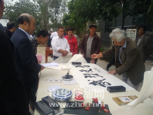 ????當(dāng)日在李寨文化廣場(chǎng)舉行的啟動(dòng)儀式上,46名省市書畫名家、志愿者同時(shí)亮相,主持人逐一介紹時(shí),現(xiàn)場(chǎng)村民就開始摩拳擦掌,為求字求畫做準(zhǔn)備。活動(dòng)開始后,文化廣場(chǎng)上一字排開的書畫案臺(tái)很快被村民圍滿(如圖)。國(guó)家一級(jí)美術(shù)師、中國(guó)美術(shù)家協(xié)會(huì)會(huì)員翟東奇,北京榮寶齋畫院特約畫家朱文華等大家的作品更是供不應(yīng)求。面對(duì)熱情的“粉絲”,書畫家們也被感染,揮毫潑墨一刻不停,送走最后一位村民,已是午后1時(shí)。
