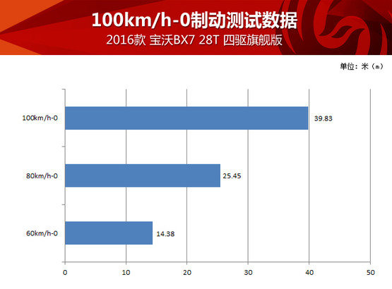 加速過后就要減速,寶沃BX7的制動系統(tǒng)在測試中經(jīng)受住考驗,不到39米的成績對于一臺SUV而言已經(jīng)算是很不錯,而且多次測試并未出現(xiàn)制動力有衰減的現(xiàn)象。