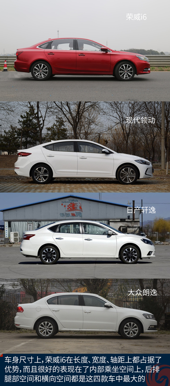從上面的表格可以看出,榮威i6的長(zhǎng)寬高分別為4671*1835*1460mm,在寬度和長(zhǎng)度上,都要優(yōu)于其他三款車。特別是車寬,達(dá)到了1835mm,橫向的寬度不僅可以提升視覺效果,對(duì)車內(nèi)橫向空間也影響很大,尤其是后排乘坐3人的時(shí)候。在軸距上,榮威i6以2715mm的數(shù)據(jù)表現(xiàn),穩(wěn)居第一位。
