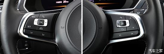 三輻式真皮方向盤(pán)造型與國(guó)產(chǎn)版本存在一定差異,中間部分采用圓形設(shè)計(jì),且邊緣鑲嵌帶有R-Line標(biāo)識(shí)的銀色飾條,視覺(jué)效果更加動(dòng)感、精致。方向盤(pán)圈輻偏細(xì),好在真皮材質(zhì)較為細(xì)膩,握感更趨向舒適,而下方采用平底造型,能夠?yàn)轳{駛員營(yíng)造更充足的腿部空間。除了常見(jiàn)的音量調(diào)節(jié)和行車(chē)電腦切換等功能外,背面還帶有換擋撥片,“不幸”的是,Tiguan的變速箱天資聰慧,用到它的幾率比較有限。