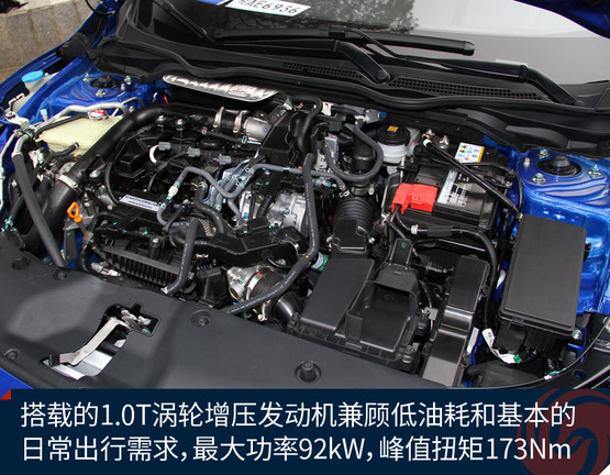 思域180TURBO車型搭載的是1.0升三缸渦輪增壓發(fā)動機,賬面上擁有的最大功率為92kW/5500rpm,最大扭矩達到了173Nm/2000-4500rpm,基本能夠達到主流1.8升自吸發(fā)動機的水平。與之匹配的CVT無級變速器大家都比較熟悉,在本田品牌的車型中已經(jīng)有著廣泛的應用。