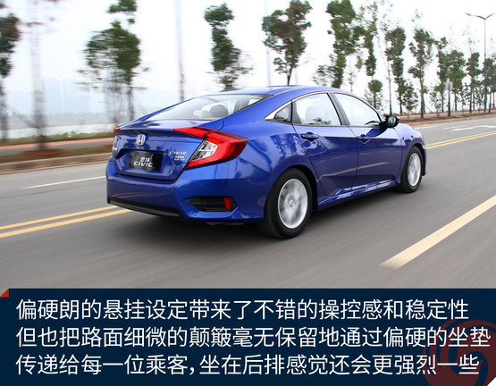 思域的定位一直偏向運動,這一代車型自然不會放棄這一特色,底盤的扎實感、懸掛偏硬朗的設定都營造了同級別里相對出色的操控感受。不過懸掛系統(tǒng)在韌性方面相對薄弱,路感太強烈,鋪裝路面上細微的不平整所帶來的振動也比較清晰地傳遞到車內(nèi)。座椅的靠背包裹感還不錯,填充也比較得體,很舒服,但坐墊偏硬,因此行駛中車輛整體對振動的抑制能力欠佳,很大程度上影響了舒適性。