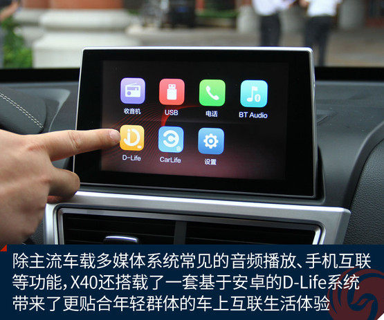 不過跟奔騰X40接觸兩天之后,會發(fā)現(xiàn)它大可不必在對手林立的市場中血拼顏值,靠實力不俗的獨門絕技一樣能夠輕松獲得一席之地。既然面向年輕用戶,豐富的車載娛樂系統(tǒng)很關(guān)鍵。大屏幕、手機互聯(lián)等等似乎已經(jīng)是這類車的標配。奔騰X40更進一步,所搭載的D-Life系統(tǒng)讓我們看到了它引領(lǐng)潮流的勁頭。