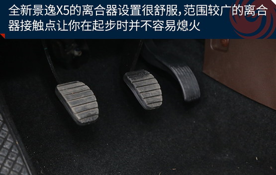 對(duì)于手動(dòng)擋車型而言,除了變速器本身外,還有一個(gè)部件十分重要那就是離合器,一個(gè)調(diào)整的十分舒適的離合器可以給駕駛者帶來(lái)更好的駕駛感受。全新景逸X5的離合器設(shè)置很舒服,雖然從腳感來(lái)說(shuō),它的離合器設(shè)定有些偏沉,但不要擔(dān)心,范圍較廣的離合器接觸點(diǎn)讓你在起步時(shí)并不容易熄火。