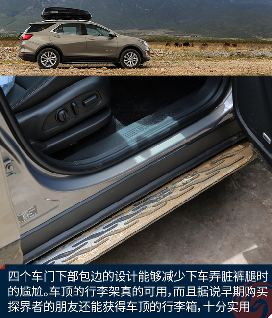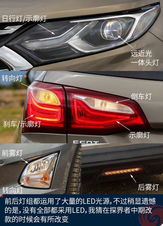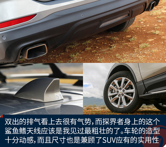 外觀上令我印象深刻的地方有這么幾個,首先前后燈組都運用了大量的LED光源,不過稍顯遺憾的是,沒有全部都采用LED,我猜在探界者中期改款的時候會有所改變。四個車門下部包邊的設(shè)計能夠減少下車弄臟褲腿時的尷尬。車頂?shù)男欣罴苷娴目捎茫覔?jù)說早期購買探界者的朋友還能獲得車頂?shù)男欣钕?,十分實用。雙出的排氣看上去很有氣勢,而探界者身上的這個鯊魚鰭天線應(yīng)該是我見過最粗壯的了。車輪的造型十分動感,而且尺寸也是兼顧了SUV應(yīng)有的實用性。