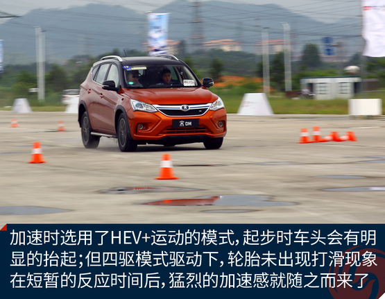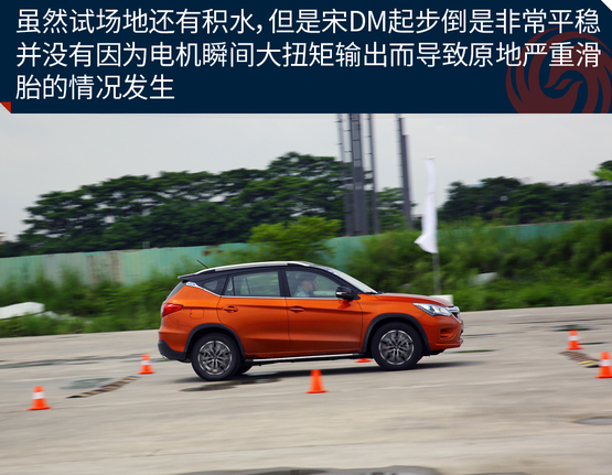 ????????為了充分體驗(yàn)宋DM的加速能力,我們?cè)谠囻{場(chǎng)地對(duì)其進(jìn)行了試駕體驗(yàn)。雖然試駕前一天下過(guò)雨,場(chǎng)地還有積水,但是宋DM起步倒是非常平穩(wěn)。并沒(méi)有因?yàn)殡姍C(jī)瞬間大扭矩輸出而導(dǎo)致原地嚴(yán)重滑胎的情況發(fā)生。經(jīng)過(guò)分析,出現(xiàn)這種情況的原因可能是宋DM全系標(biāo)配了ESP車輛穩(wěn)態(tài)控制系統(tǒng),因此在起步時(shí)或者濕滑路面上行駛也能保證平穩(wěn);另一個(gè)原因是宋DM搭配了全時(shí)電四驅(qū),車輛前后軸上各搭載有電機(jī),四輪驅(qū)動(dòng)讓車輛的動(dòng)力輸出更順暢和均衡。