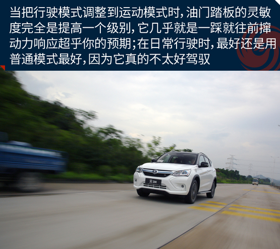 ????????在混合動(dòng)力模式下,將駕駛模式調(diào)整為SPORT模式,由于起步階段是電機(jī)發(fā)力,因此并不像汽油車那樣靠吊轉(zhuǎn)速來(lái)獲得最大的扭矩。此時(shí),你只需將油門踩到底,任由宋DM的電機(jī)和發(fā)動(dòng)機(jī)發(fā)力就行,而大扭矩帶來(lái)的直接體驗(yàn)就是,身體像是被摁壓在座椅上,任由車輛來(lái)讓我體驗(yàn)G值給身體所帶來(lái)的快感,而這種“變態(tài)”的加速感體驗(yàn)確實(shí)是非常的過(guò)癮;可當(dāng)你還在意猶未盡地回味這速度高潮的時(shí)候,不知不覺(jué)就到了該踩剎車的節(jié)點(diǎn)。