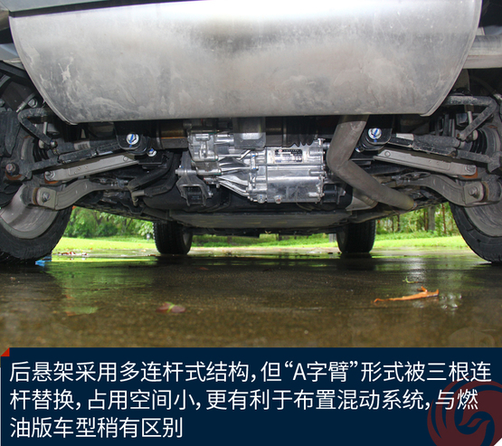????????由于電池放置在車輛的底盤(pán)和后備廂底部,降低了最小離地間隙。后懸架采用多連桿式結(jié)構(gòu),但“A字臂”形式被三根連桿替換,占用空間小,更有利于布置混動(dòng)系統(tǒng),與燃油版車型稍有區(qū)別。