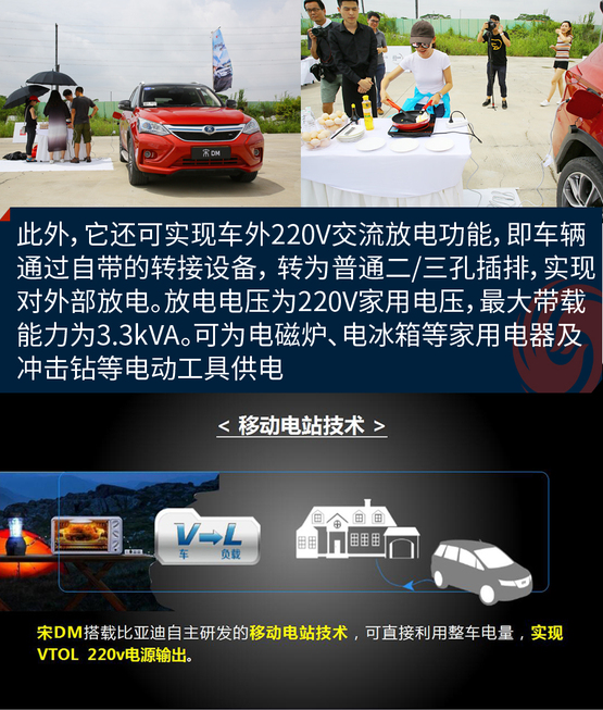 ????????宋DM可實(shí)現(xiàn)車外220V交流放電功能(VTOL),即車輛可通過(guò)自帶的轉(zhuǎn)接設(shè)備, 轉(zhuǎn)為普通二/三孔插排,實(shí)現(xiàn)對(duì)外部用電器放電。放電電壓為220V家用電壓,最大帶載能力為3.3kVA,給日常家用電器供電一點(diǎn)沒(méi)問(wèn)題。