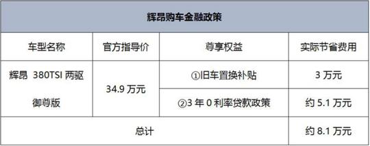 ????????目前購(gòu)買輝昂,可享受首付30%,三年零利率的金融政策,同時(shí)還可以享受3萬(wàn)元置換補(bǔ)貼或者1萬(wàn)元保險(xiǎn)補(bǔ)貼,詳情請(qǐng)見下表: