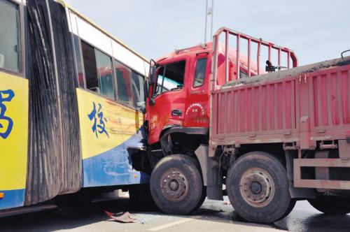 ????????記者觀察到,大客車側面寫有“交通駕?!币恍写笞郑囶^朝西車尾朝東停著,右側車身被橋墩緊緊卡住;運水罐車長近20米,車身與大客車車身幾乎呈90度直角,運水罐車車頭撞在大客車的左后側,將大客車撞癟了。事發(fā)地點位于橋坡處,地面遍布七零八落的玻璃碎片,運水罐車下面還有少量血跡。運水罐車和大客車內(nèi)均空無一人。