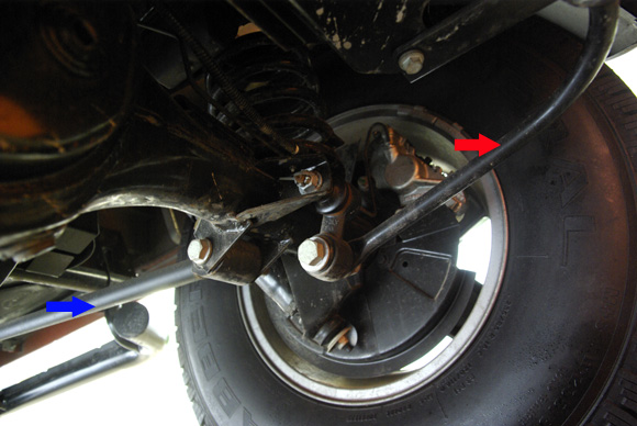 ????衛(wèi)士的后軸采用拖臂式后懸,紅色箭頭所指的拉桿就是拖臂。左右各一根,拖臂及避震機(jī)對后軸的自由度進(jìn)行控制,后軸相對車架的位置和自身的扭轉(zhuǎn)都得到了控制。