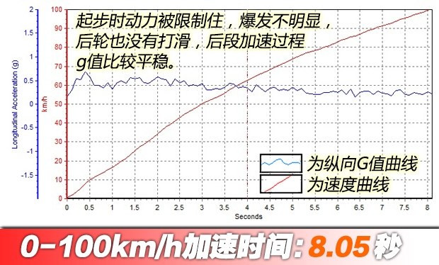 ????雖然可以關(guān)閉穩(wěn)定系統(tǒng),但感覺卻對(duì)發(fā)動(dòng)機(jī)輸出非常保守,變速箱也不允許拉到很高的轉(zhuǎn)速。起步后車輪沒有明顯滑動(dòng),說明并沒有達(dá)到最佳輸出狀態(tài),最終成績?yōu)?.05秒,成績與老款車型有差距,略有遺憾。