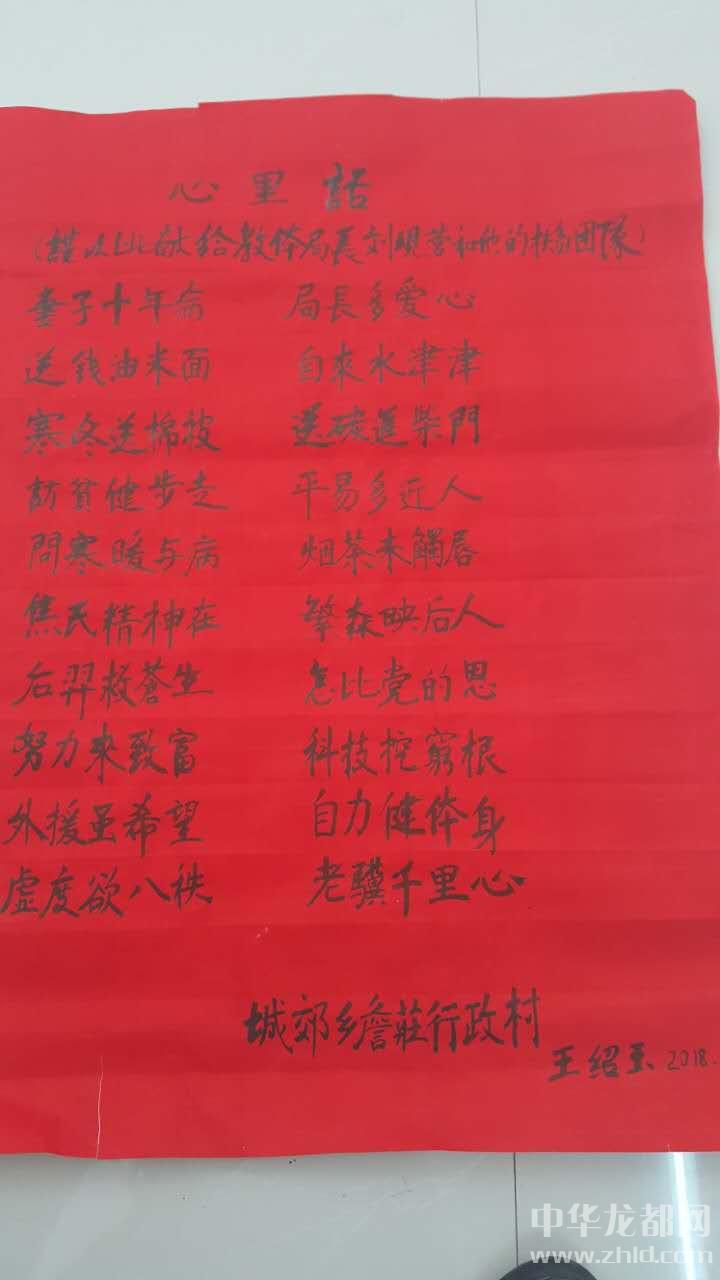 “我推敲了幾個(gè)半夜,寫了《心里話——謹(jǐn)以此獻(xiàn)給教體局局長(zhǎng)劉現(xiàn)營(yíng)和他的扶貧團(tuán)隊(duì)》這首五言排律,表表我和老伴及全村對(duì)您的感激之情?!薄捌拮邮瓴。珠L(zhǎng)多愛心。送錢米油面,自來水津津。寒冬送棉被,送炭至柴門。訪貧健步走,平易又近人?!蓖踅B玉聲情并茂地朗讀著,劉局長(zhǎng)爽朗地笑了,“老伴劉桂蘭藥按時(shí)吃了嗎?”“按時(shí)吃了,多虧您,到我家宣講扶貧政策,幫助我聯(lián)系有關(guān)單位,我老伴享受了慢性病醫(yī)保?!薄肮鹛m說,人家劉局長(zhǎng)隔三差五給咱送米面油,逢年過節(jié)給咱送慰問金,前幾天頂風(fēng)冒雪送來兩床被子,一年不知來了多少趟,待咱比親人還親??!我家也沒有什么拿出手的,我倆一合計(jì),就發(fā)揮我的一點(diǎn)專長(zhǎng),給您寫了首詩(shī),您經(jīng)常去我家噓寒問暖,我今個(gè)也來您這,算是走走親戚吧,回報(bào)回報(bào)您!”