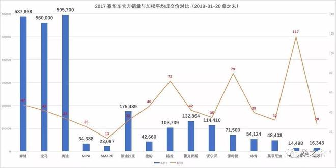 銷售的數(shù)量固然重要,但是銷售質(zhì)量也是評估銷售力不能忽視的重要指標(biāo)。衡量銷售質(zhì)量,“加權(quán)平均成交價”和“單車?yán)麧櫋边@兩個重要參數(shù),也許讓我們更直觀的看到車企的銷售能力與經(jīng)銷商單店經(jīng)營質(zhì)量。這些更微觀的數(shù)據(jù)往往更能反映銷售公司及其經(jīng)銷商體系的銷售能力及水平?!凹訖?quán)平均成交價”反映車企的產(chǎn)品力與銷售公司的銷售能力,車企賣掉的車越多,單車價格越貴,品牌就越具有競爭力,反之就需要考慮改進產(chǎn)品,提升銷售管理能力?!皢诬?yán)麧櫋敝附?jīng)銷商銷售新車獲取的利潤,不含衍生利潤,一般在-4%-7%之間,如果單車?yán)麧櫝^-2%,廠家需要考慮對經(jīng)銷商進行補貼,如果利潤超過7%,車企就會調(diào)整經(jīng)銷商浮動返利。下面我們通過這兩個指標(biāo),來看哪些豪華車品牌在2017年表現(xiàn)更具實力。