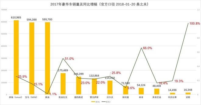 以官方披露的銷量口徑計算,奔馳(含smart)全年銷量為610,965輛,增長25.9%,成為中國市場首家銷量超過60萬輛的豪華車品牌,銷售總量名列第一;奧迪全年銷量為595,700輛,增長1.1%;寶馬(含Mini)全年銷量為594,388輛,增長15.1%。如果按單一品牌統(tǒng)計,奧迪品牌銷量為595,700輛,寶馬品牌為56萬輛,奔馳品牌(含v級車)為587,868輛,奧迪品牌蟬聯(lián)2017年中國豪華車第一。