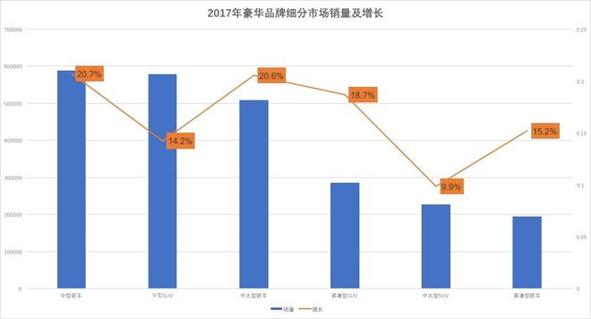 2017年豪華車市場中六大細分市場(中大型轎車、中型轎車、緊湊型轎車、中大型SUV、中型SUV、緊湊型SUV)占據(jù)豪華車全年93%的銷量,環(huán)比增長17.3%,市場集中度進一步提升;豪華車企業(yè)如果想與市場同步增長,就不得不在這個六個細分市場投放車型,并提升產(chǎn)品競爭力。