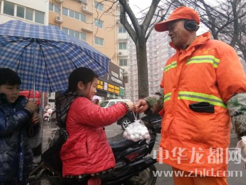 2月27日下午3點(diǎn),兩個(gè)小學(xué)生模樣的小朋友冒雨出現(xiàn)在鄭州市三全路與豐慶路口,他們正是“羊肉哥”孫合理的一雙兒女。女兒名叫孫夢露,8歲,兒子名叫孫浩,6歲。他們手里提著元宵,一路給轄區(qū)環(huán)衛(wèi)工人發(fā)放。