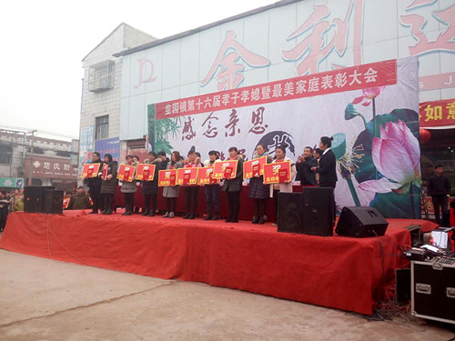 歡快的音樂聲中,胸戴大紅花的96名“孝子孝媳”和20個“最美家庭”代表依次上臺,領(lǐng)取榮譽證書和獎品。