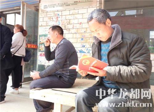 從韓學(xué)慎家中出來后,楊素華正好遇到66歲的村民韓武孔。韓武孔拿到憲法后,不顧小賣部前人多噪雜,便坐在一張木床上認真地看起來。