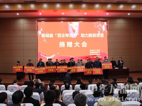 中華龍都網(wǎng)訊(周口報(bào)業(yè)全媒體記者 徐松 文/圖)4月13日,鄲城縣召開“百企幫百村”助力脫貧攻堅(jiān)捐贈(zèng)大會(huì),全縣129家企業(yè)反哺社會(huì)助力脫貧攻堅(jiān),現(xiàn)場(chǎng)捐贈(zèng)近1300萬(wàn)元。鄲城縣四個(gè)班子領(lǐng)導(dǎo)、部分縣處級(jí)領(lǐng)導(dǎo)干部、縣慈善會(huì)會(huì)長(zhǎng)、縣扶貧協(xié)會(huì)會(huì)長(zhǎng)、縣直各單位和鄉(xiāng)鎮(zhèn)負(fù)責(zé)人等參加捐贈(zèng)大會(huì)??h委書記羅文閣發(fā)表講話,縣長(zhǎng)李全林主持會(huì)議。