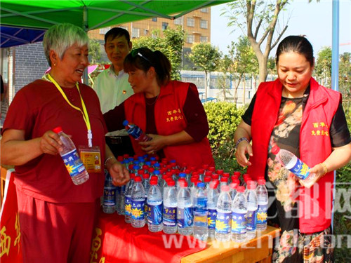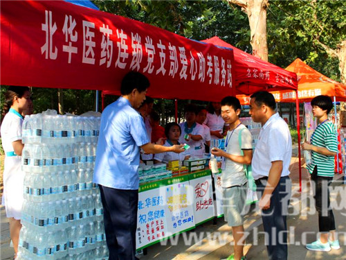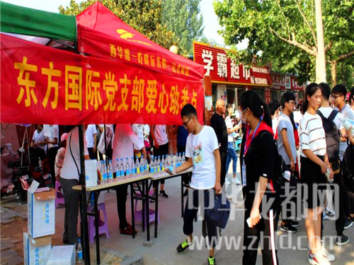 愛(ài)心助考活動(dòng)現(xiàn)場(chǎng),西華縣真愛(ài)醫(yī)院黨支部設(shè)立的“黨旗引領(lǐng)、護(hù)航高考”的大紅愛(ài)心助考條幅分外惹眼,黨員志愿者們免費(fèi)為考生提供藿香正氣水、風(fēng)油精、退燒藥等,并有醫(yī)護(hù)人員現(xiàn)場(chǎng)提供急救服務(wù)。在西華縣恒生醫(yī)院黨支部愛(ài)心助考點(diǎn)前,3名醫(yī)護(hù)人員正在免費(fèi)為考生及家長(zhǎng)提供風(fēng)油精、清涼油、仁丹、藿香正氣水等防暑降溫藥品和急救藥品,還有擔(dān)架、120急救車(chē)輛等。西華縣北華醫(yī)藥黨支部愛(ài)心助考服務(wù)站的黨員志愿者,正在向考生免費(fèi)提供防暑降溫藥、感冒發(fā)燒藥、拉肚子藥等藥品。黨員志愿者愛(ài)心企業(yè)代表宋女士說(shuō):“在高考期間,我們?yōu)榭忌凹议L(zhǎng)免費(fèi)提供礦泉水、芭蕉扇、清涼油等多項(xiàng)服務(wù),除了愛(ài)心,更多的是一份責(zé)任和使命。”