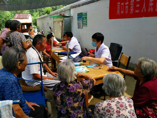 8時40分許,醫(yī)護(hù)人員在文莊社區(qū)衛(wèi)生室的醫(yī)務(wù)人員的協(xié)助下搭起了臨時義診臺,為村民測血糖、量血壓,并針對測量結(jié)果給出用藥指導(dǎo),為村民提供健康咨詢服務(wù),現(xiàn)場解答健康問題,并根據(jù)部分村民身體狀況提出合理的防治建議。
