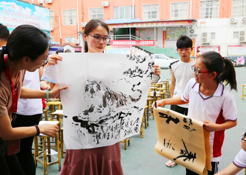 中華龍都網(wǎng)訊(周口報(bào)業(yè)全媒體記者 李瑞才 通訊員 孫廣合 胡洪濤)6月26日上午,鹿邑縣政協(xié)和縣文聯(lián)聯(lián)合開展“到人民中去”送書畫進(jìn)校園活動(dòng),組織10余位知名書畫家走進(jìn)校園,現(xiàn)場(chǎng)揮毫潑墨,為師生義寫字畫。