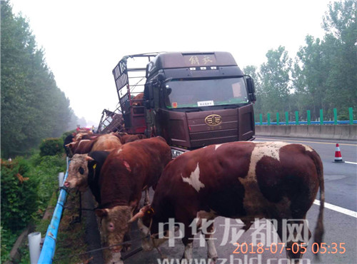 中華龍都網(wǎng)訊(周口報(bào)業(yè)全媒體記者 姬慧洋 通訊員 劉杰 文/圖)“在大廣高速2025公里西半幅附近發(fā)生一起單方事故,幾十頭牛散落在路面,請求處警。”7月5日5時(shí)許,周口市公安局交通管理支隊(duì)高速二大隊(duì)扶溝中隊(duì)接到110指令稱。