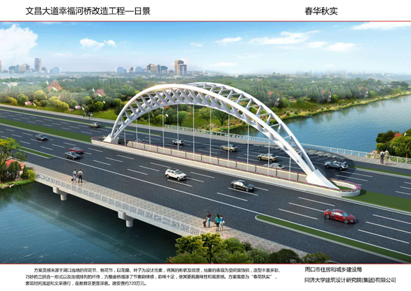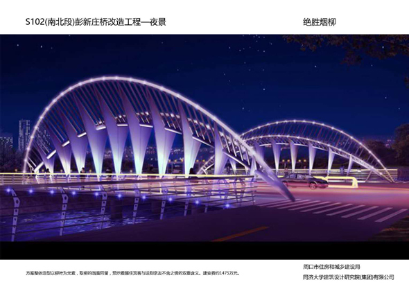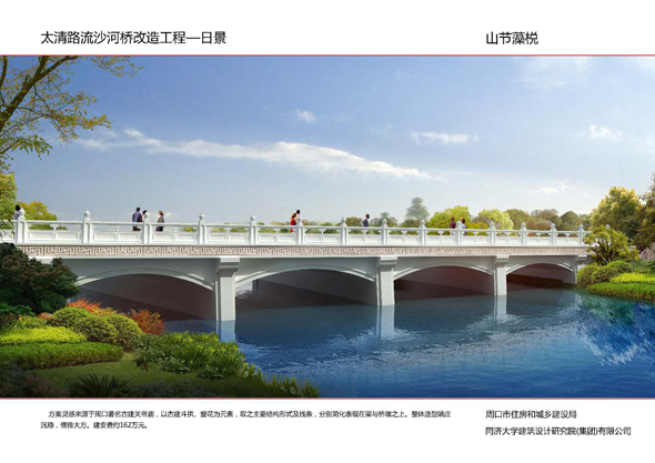 周口大道沙潁河橋景觀改造,設(shè)計(jì)造型簡(jiǎn)單柔美,如行云流水,同時(shí)與沙潁河景觀帶相融合,給城市增添了生機(jī)與活力。周口大道賈東干渠橋以荷葉為設(shè)計(jì)元素,造型簡(jiǎn)約而不失細(xì)節(jié)。周口大道流沙河橋造型簡(jiǎn)潔大氣,線條流暢,像一條青龍游弋在水面上。文昌大道幸福河橋以花瓣、葉子為設(shè)計(jì)元素,造型豐富多彩。文昌大道流沙河故道橋在中分帶位置修建花壇,花壇造型莊重古樸,景石造型端莊沉穩(wěn)。太清路流沙河橋以古建斗拱、窗花為元素,造型儒雅大方。太清路洼沖溝2號(hào)橋以“輻轂相依”為名,既融合環(huán)境,又有團(tuán)結(jié)、合作的寓意。太清路賈魯河橋,增加了景觀造型,使人們可以重溫當(dāng)年賈魯河的美好畫(huà)卷。彭新莊橋以柳葉為元素,預(yù)示著留住賓客與送別親友的不舍之情的雙重含義。