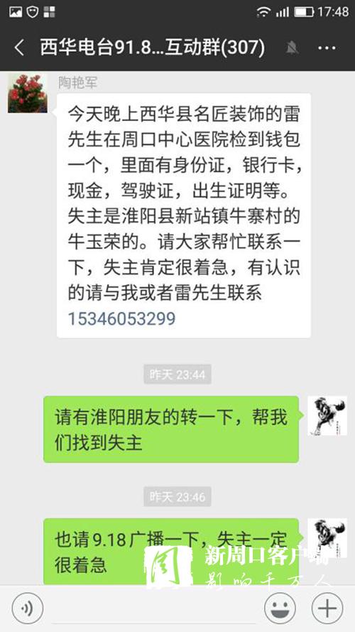 很快,一條尋找失主的愛心信息,便通過無線網(wǎng)絡(luò),乘著夜色翅膀,在豫東大地的西華縣政協(xié)群、西華縣非公黨工委群、西華縣城市管理群、西華縣愛心粥屋群、西華電臺(tái)91.8互動(dòng)群、周口市個(gè)私協(xié)會(huì)系統(tǒng)群、淮陽縣非公黨工委群、淮陽縣文明辦群、淮陽縣城市管理群等微信群迅速散發(fā)開來。很多群友進(jìn)行轉(zhuǎn)發(fā)、點(diǎn)贊。