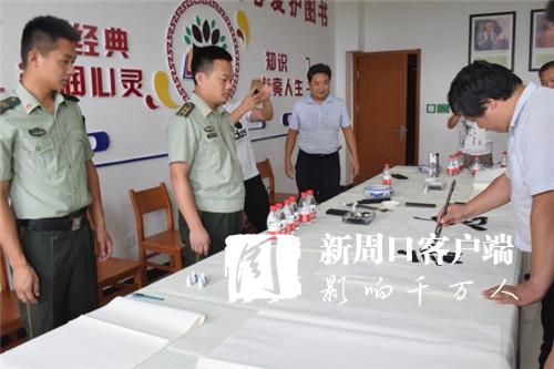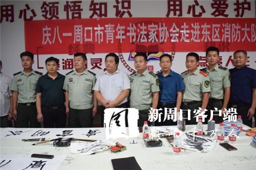 為進(jìn)一步充實(shí)官兵的警營(yíng)文化生活,喜迎建軍91周年,7月30日下午,周口市青年書(shū)法家協(xié)會(huì)會(huì)長(zhǎng)李為等人走進(jìn)東新區(qū)消防大隊(duì),現(xiàn)場(chǎng)揮毫潑墨,用飽蘸感情的書(shū)法作品向消防官兵表達(dá)了節(jié)日祝福。