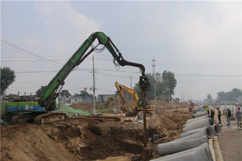 8月28日上午,記者在周項路武盛大道交叉口看到,工程車輛正在馬路南側(cè)人行道鋪設(shè)柏油路面,十幾名工人頂著烈日,在現(xiàn)場作業(yè)。周項路苑寨市場門前,施工人員正在向基坑內(nèi)打樁,施工人員告訴記者,由于周邊地質(zhì)屬于流沙段,容易塌方,因此需要使用LV拉森鋼板樁進(jìn)行加固。在李埠口鄉(xiāng)政府東側(cè),工人們正在鋪設(shè)地磚。周項路港區(qū)路段,隨處可見施工人員。