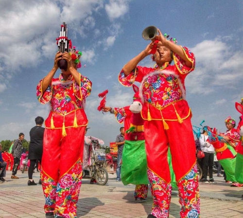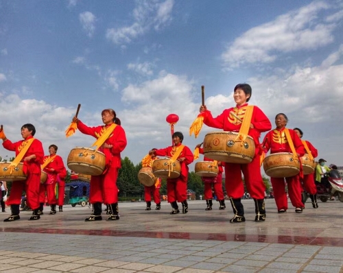 廣場(chǎng)上,一排排碩大的紅氫氣球高懸,氣球下縣掛著祝賀農(nóng)民豐收節(jié)的標(biāo)語(yǔ)。穿著各種鮮艷顏色的表演服裝的民間藝術(shù)表演隊(duì),給節(jié)日增光添彩,擂響盤(pán)鼓,為節(jié)日助威。從全縣23個(gè)鄉(xiāng)鎮(zhèn)起早趕來(lái)的46支民間藝術(shù)表演隊(duì)伍,伴隨著悠揚(yáng)的音樂(lè),喧天的鑼鼓在廣場(chǎng)上各顯其能。腰鼓、盤(pán)鼓、耍獅子、劃旱船、抬花轎、挑花籃、廣場(chǎng)舞也以不同的方式表達(dá)著豐收的喜悅。