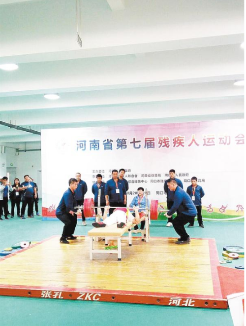 10月24日下午,在河南省第七屆殘疾人運動會男子舉重65公斤級比賽中,南陽選手范天增以185公斤的成績強勢奪冠,遠(yuǎn)高于第二名信陽選手湯孝虎95公斤的成績。②8記者 張志新 攝