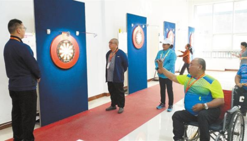 10月24日下午,河南省第七屆殘疾人運動會飛鏢項目坐姿組比賽在市體育中心老年館進行。參賽選手在認(rèn)真比賽的同時,也會在比賽間隙放松心情,相互分享各自的心得,享受比賽的過程。②8 記者 牛思光 攝