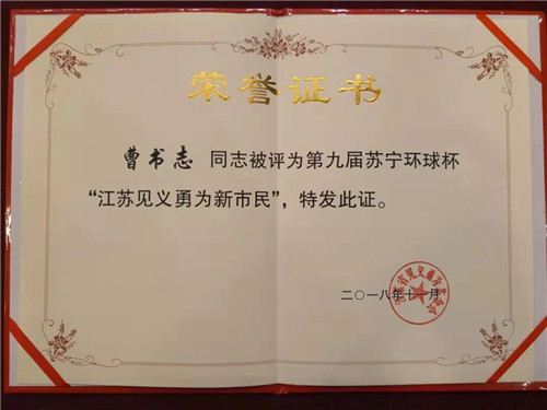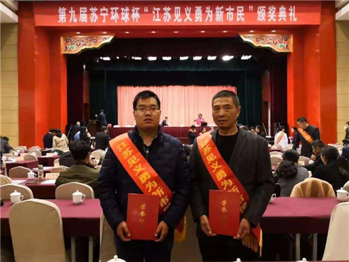 11月14日,江蘇省見(jiàn)義勇為基金會(huì)第九屆蘇寧環(huán)球杯“江蘇見(jiàn)義勇為新市民”頒獎(jiǎng)典禮在南京舉行,來(lái)自河南省項(xiàng)城市新橋鎮(zhèn)的農(nóng)民工曹書(shū)志獲此殊榮。