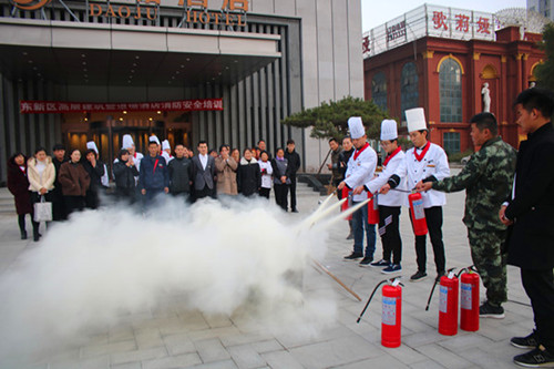 在培訓(xùn)現(xiàn)場,為更好地將學(xué)到的知識與實踐相結(jié)合,大隊宣傳人員組織參訓(xùn)人員開展了實地滅火消防演練,酒店全體員工分批次輪番上陣,通過使用滅火器及時迅速地?fù)錅缁馂?zāi)操練,提高參訓(xùn)人員正確規(guī)范使用滅火器材的能力,達(dá)到了良好效果。