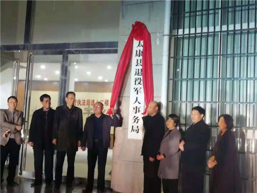 11月27日,太康縣退役軍人事務(wù)局掛牌成立??h委常委、常務(wù)副縣長(zhǎng)張保華,縣委常委、副縣長(zhǎng)韓維俊,縣政協(xié)副主席、縣民政局局長(zhǎng)劉鳳芹出席揭牌儀式。縣編辦主任毛雙龍、縣退役軍人事務(wù)局干部職工參加揭牌儀式。