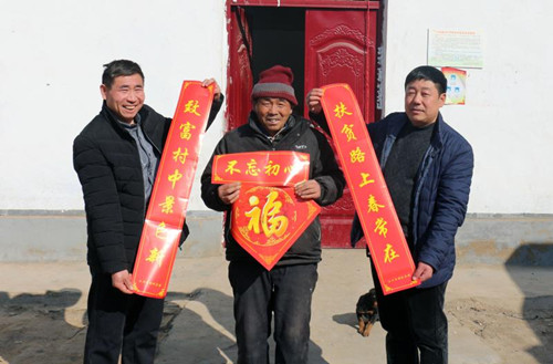 1月24日,扶溝縣白潭鎮(zhèn)王村貧困戶王奎鎖喜滋滋地從縣財(cái)政局扶貧工作人員手中接過對(duì)聯(lián)。為營(yíng)造歡樂祥和、文明有序的節(jié)日氛圍,宣傳扶貧政策,扶溝縣財(cái)政局對(duì)所幫扶7個(gè)行政村開展“情暖萬家·迎新春送春聯(lián)”助力脫貧攻堅(jiān)活動(dòng),以此傳達(dá)黨的十九大精神和脫貧攻堅(jiān)精神。