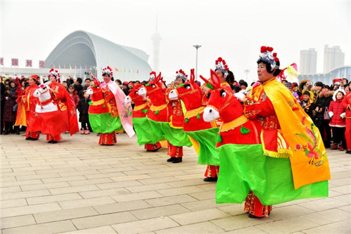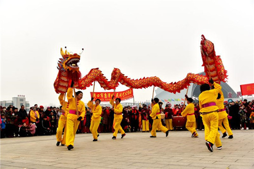 展演現(xiàn)場,人頭攢動(dòng),鑼鼓喧囂,16名身穿金黃、亮藍(lán)衣服的舞龍隊(duì)員率先登場,金燦燦的巨龍時(shí)而甩尾前行,時(shí)而昂首盤踞,浩浩蕩蕩;8只舞獅歡騰雀躍、活靈活現(xiàn);精美的裝飾的旱船穿行其中,老生、老旦扮相的隊(duì)員邊走邊唱;整齊劃一的腰鼓隊(duì)以及隊(duì)形優(yōu)美的擔(dān)經(jīng)挑把現(xiàn)場氣氛推向高潮……持續(xù)近2小時(shí)的展演活動(dòng)中,精彩的民俗表演令人目不暇接,為這座城市增添了濃濃的年味。