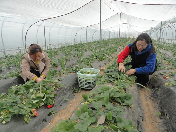 2月27日,商水縣鄧城鎮(zhèn)返鄉(xiāng)創(chuàng)業(yè)標(biāo)兵、鎮(zhèn)人大代表馮杰(右)對(duì)草莓進(jìn)行疏葉管理。馮杰在鎮(zhèn)人大、工商聯(lián)幫助下創(chuàng)辦了生態(tài)葡萄園,并種植了溫室草莓,安排了50名貧困戶(hù)就業(yè)。