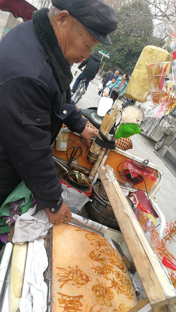 以糖稀為原料制作一幅糖畫(huà),只需要1分多鐘。昨日,記者在中心城區(qū)七一路與六一路交叉口附近,目睹了閆先生制作糖畫(huà)的過(guò)程。閆先生以糖稀為原料制作的小動(dòng)物惟妙惟肖,還有“?!薄皭?ài)”等字。閆先生告訴記者,他是周口本地人,制作糖畫(huà)已30多年。記者 關(guān)秋麗 攝