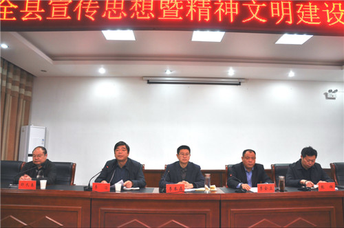 就如何做好今年的宣傳思想和精神文明建設(shè)工作,李本磊要求,要用好“學(xué)習(xí)強國”平臺,強化理論武裝;要建好新時代文明實踐中心、鄉(xiāng)村志愿服務(wù)中心、縣級融媒體中心,筑牢基層陣地;要抓好“三城兩縣聯(lián)創(chuàng)”“六村共建”“三個起來”等三項活動,普惠人民群眾;要突出工作主線,聚焦主題宣傳;要堅持團結(jié)鼓勁,營造輿論強勢;要立足凝神聚氣,倡樹文明新風(fēng);要發(fā)揮比較優(yōu)勢,打造文化強縣;要著力增強“四力”,建設(shè)一流隊伍。