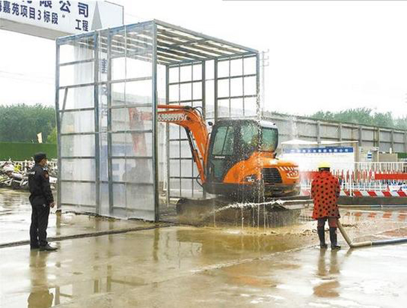 4月27日上午,川匯區(qū)一工地大門口,準(zhǔn)備駛出工地的工程車正接受清洗。工作人員說,每輛工程車都有規(guī)定的清洗時(shí)間,一般是兩分多鐘,保證從工地出去的車輛干干凈凈。記者 王凱 攝